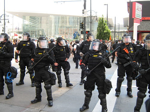 Being so busy with the Roadshow, I figured I'd miss the action that was bound to ensue at the convention, but, by chance, I heard a report of a "riot" breaking out not two blocks away from the Green Fest. I decided to borrow a bike and ride over to check it out. The "riot" consisted of a couple black flags, and a few dozen storm troopers, in full regalia. As I expected, the only visible signs of violence were embodied in the weapons of the authorities. I bet they've been waiting all year to show off their new toys! People looked on in awe, hesitating to jay-walk for fear of being pepper sprayed or hit with rubber bullets and batons. Quite the demonstration of power. Let's not forget who's in control. "Who's streets?" Their streets, clearly.